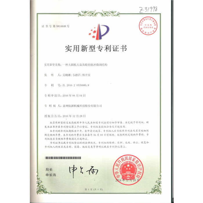新型-泉州佰源機械科技股份有限公司 一種大圓機大盤齒輪的脈沖微調結構 實用新型專利證書
